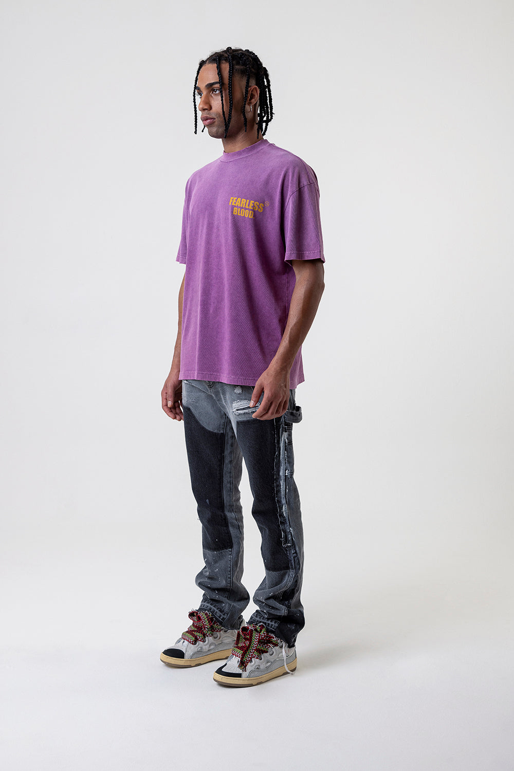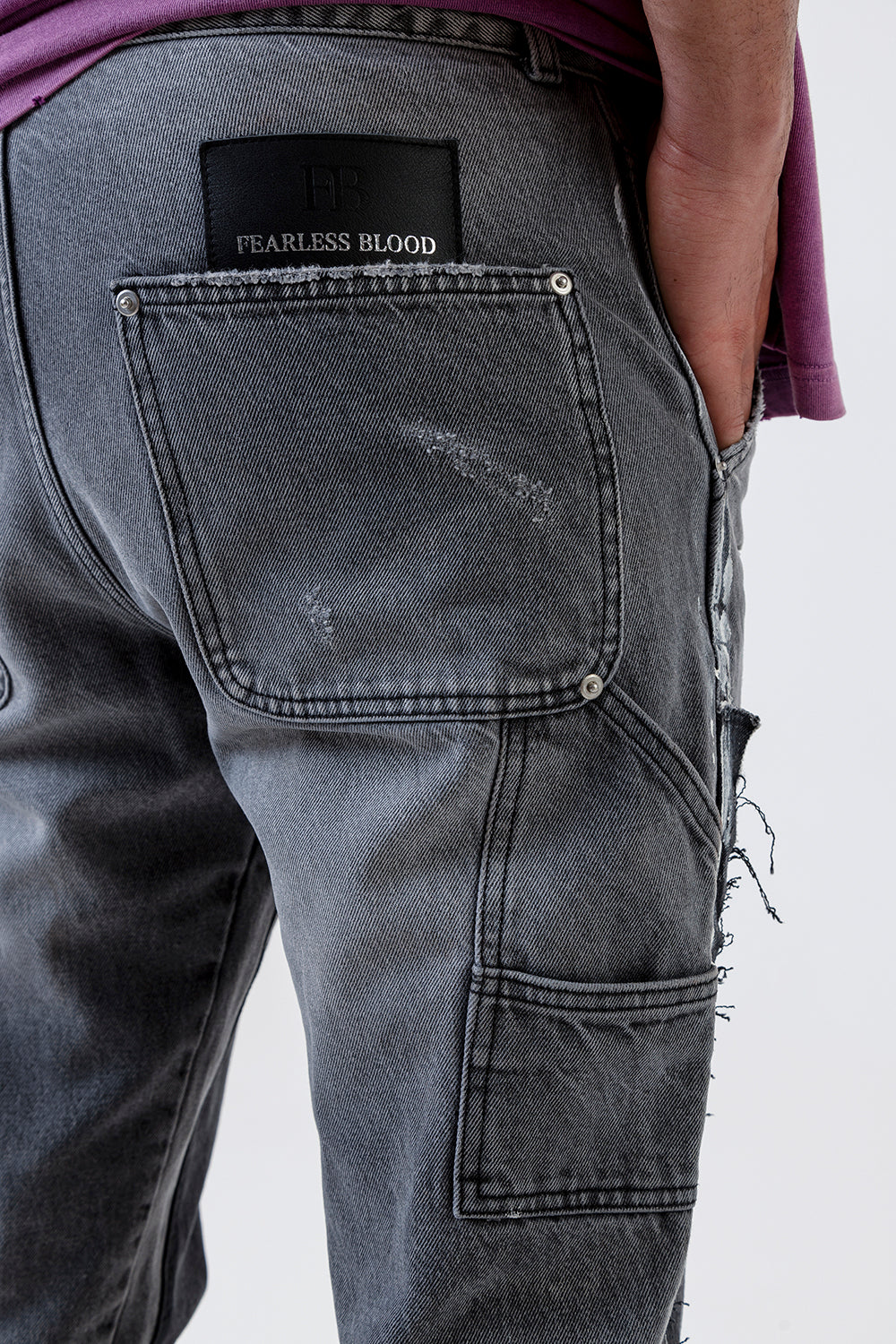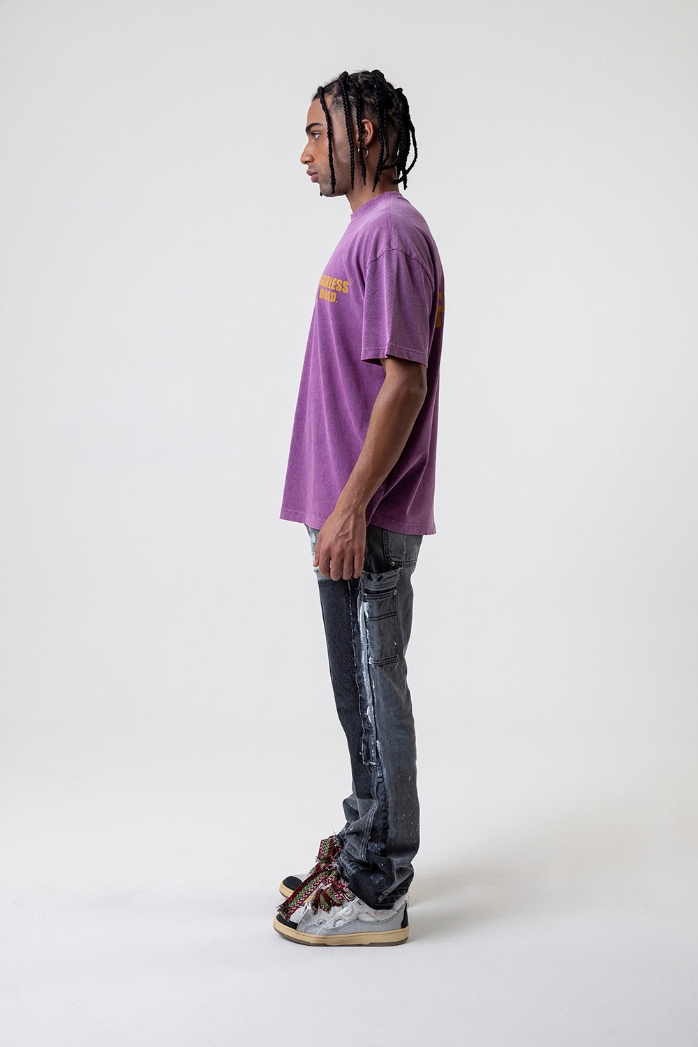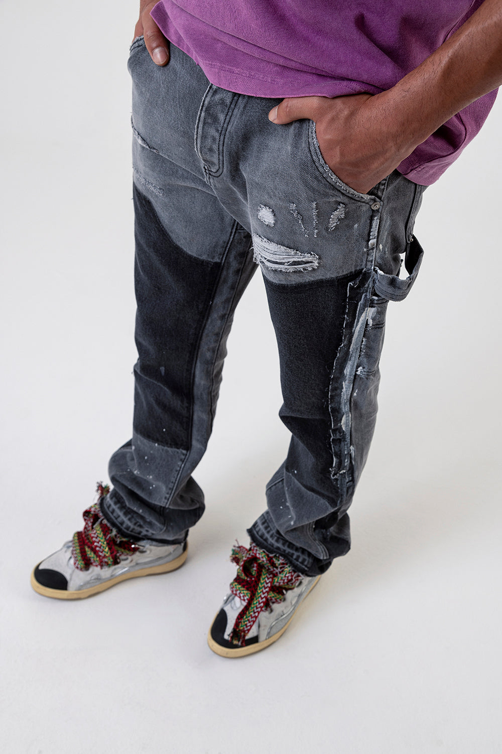 Introducing our Flare-Worker Denim Pant, a true vintage gem. Crafted from premium 14 OZ denim, it guarantees both durability and style. The destroyed wash with paint drops creates a unique and edgy look. Complete with a leather backpatch and damadge details at the ribbing and bottom, this pant exudes character.