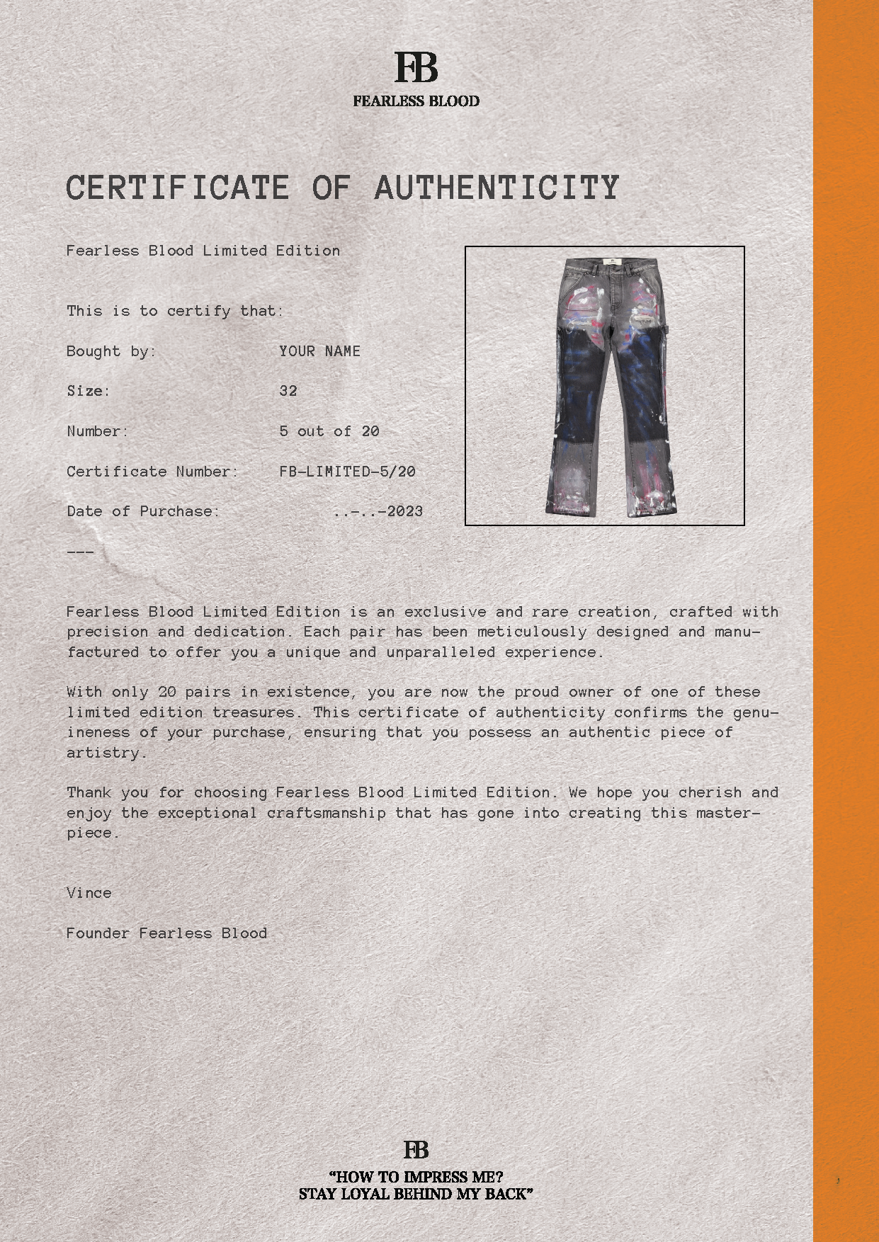 * When you purchase Fearless Blood Limited Edition, you're not just acquiring a pair of denims; you're acquiring a piece of history. Every pair comes with a Certificate of Origin, attesting to its authenticity and exclusivity. It's a testament to the precision and dedication that goes into crafting each pair.
