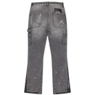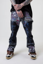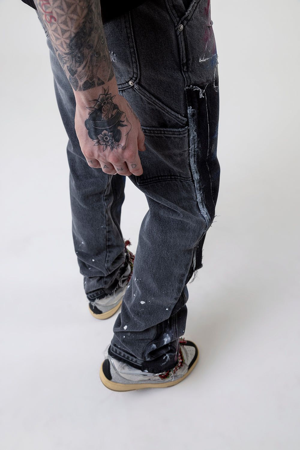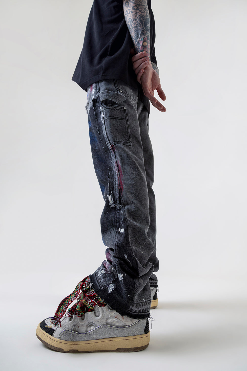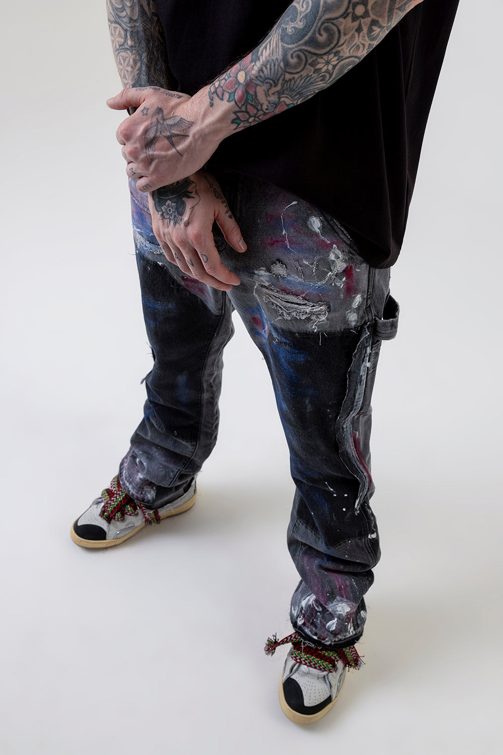 Introducing our limited edition Flare-Worker Denim Pant, a true vintage gem. Crafted from premium 14 OZ denim, it guarantees both durability and style. The destroyed wash with paint drops creates a unique and edgy look. Complete with a leather backpatch and damadge details at the ribbing and bottom, this pant exudes character.