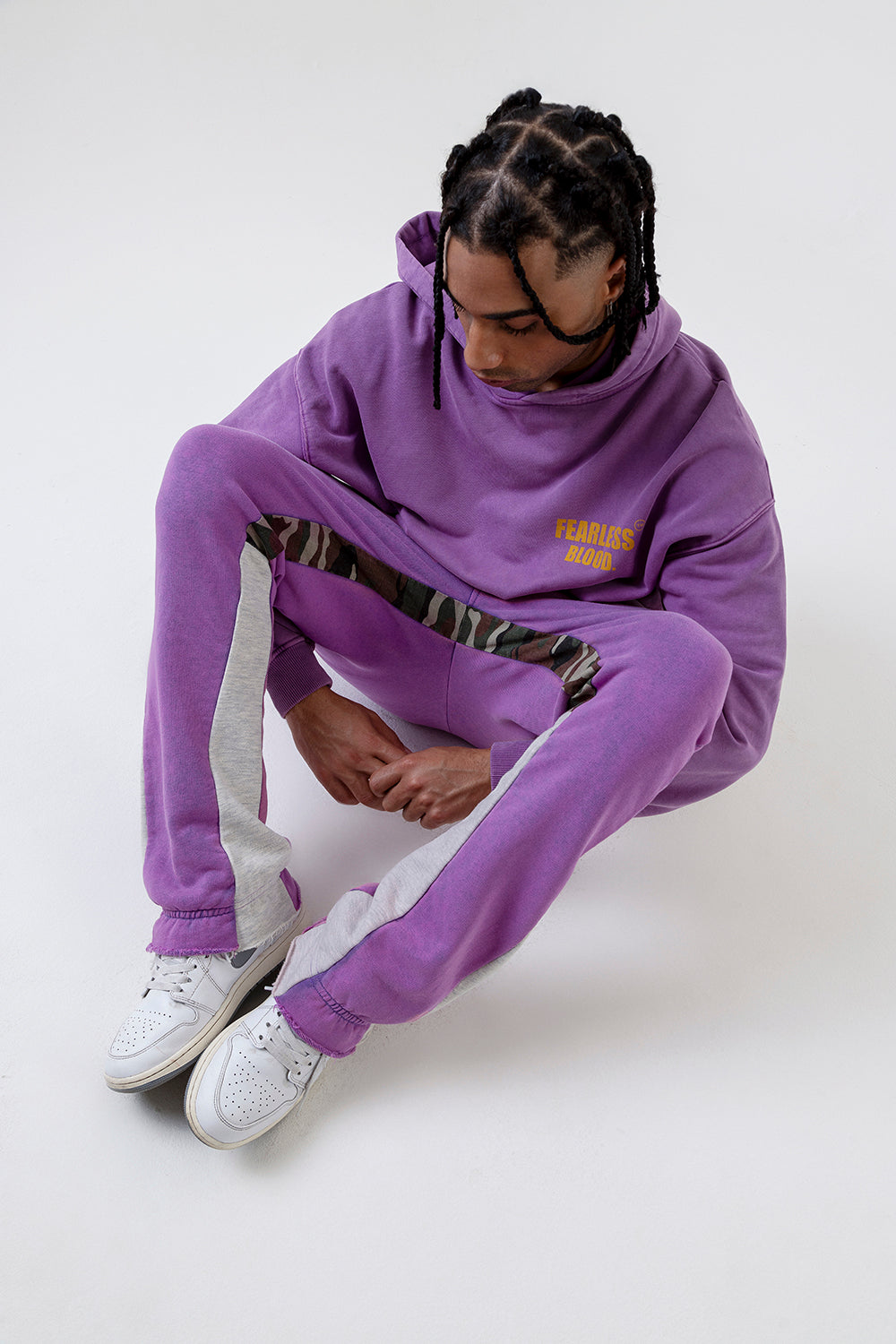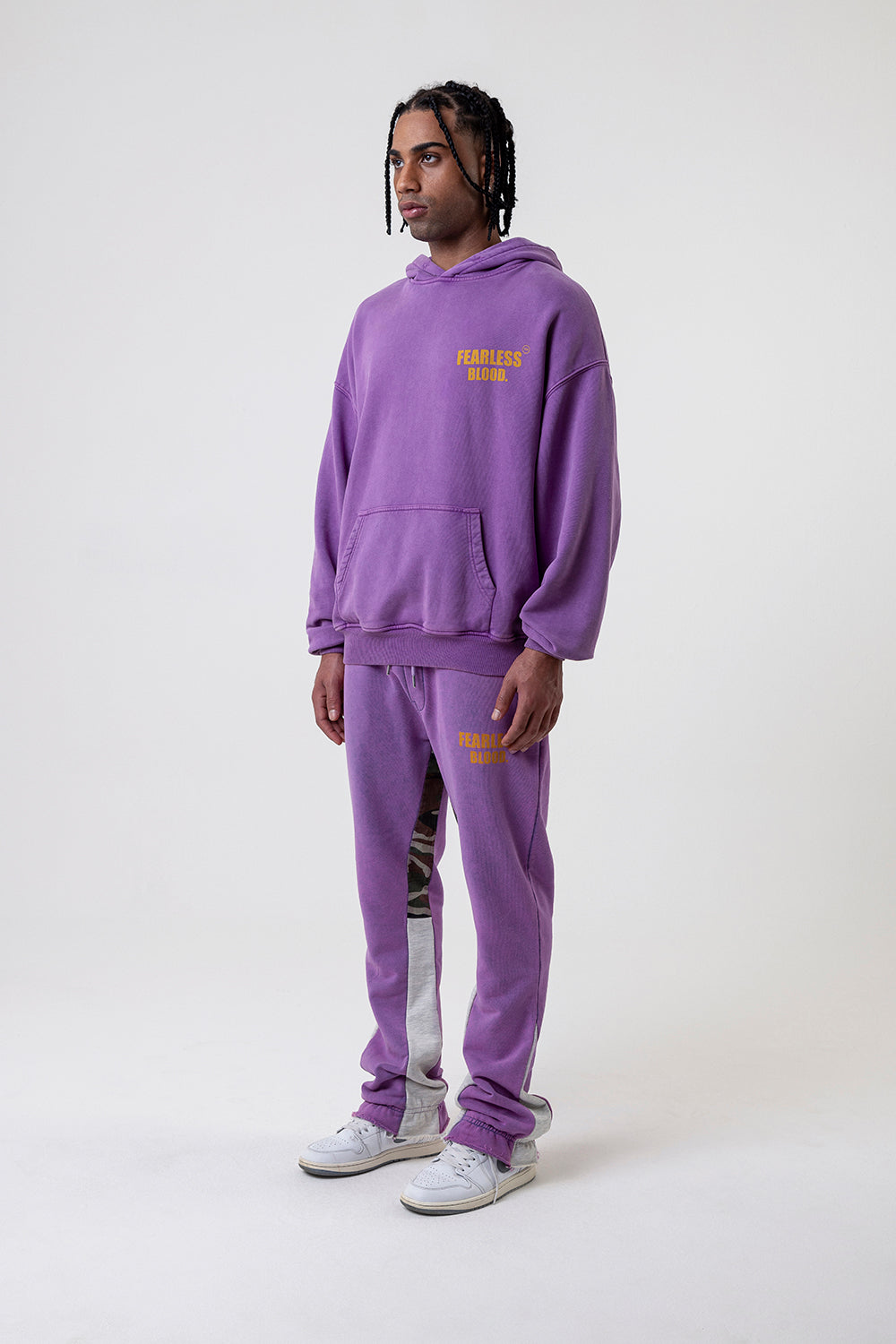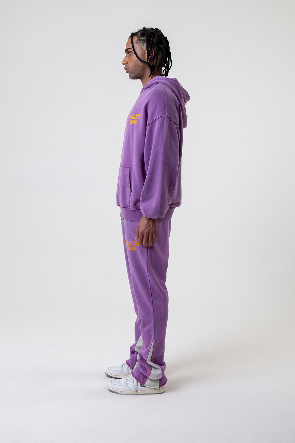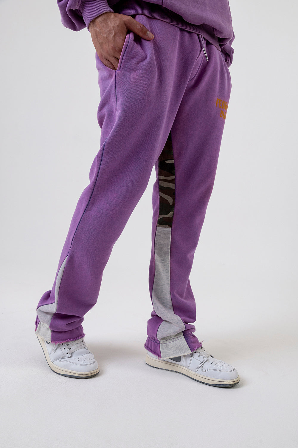 Fearless Blood presents its Vintage Sweatpants collection, showcasing a captivating True Purple color. These bootcut bottoms exude a vintage vibe with their army-inspired woven detailing along the inside leg. Crafted from 100% cotton, they offer both comfort and style. Embrace fearless fashion with our high-quality sweatpants.